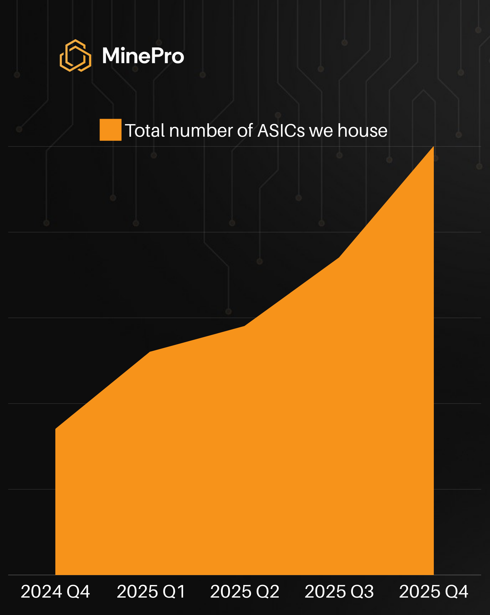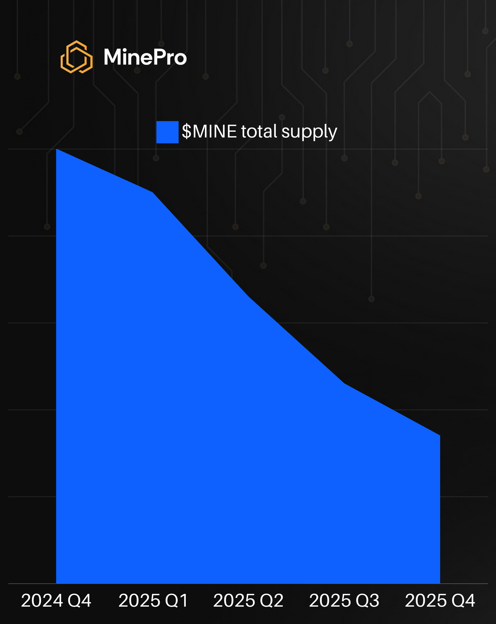 By building $MINE as a deflationary token as well as running our hosting business, MinePro prioritizes an increase in $MINE's yield percentage offering over time for staked investors. While it may seem counter-intuitive to reject a minting or traditional capital investment system for endless expansion of the amount of ASICs we house, we instead pursue a unique model wherein the offered yield percentage keeps increasing as the total supply of $MINE **decreases**, and the total amount of ASICs we house as well as Bitcoin we yield monthly **increases. Meaning larger and larger monthly BTC rewards over time, with a lower and lower token pool for them to be shared to.**