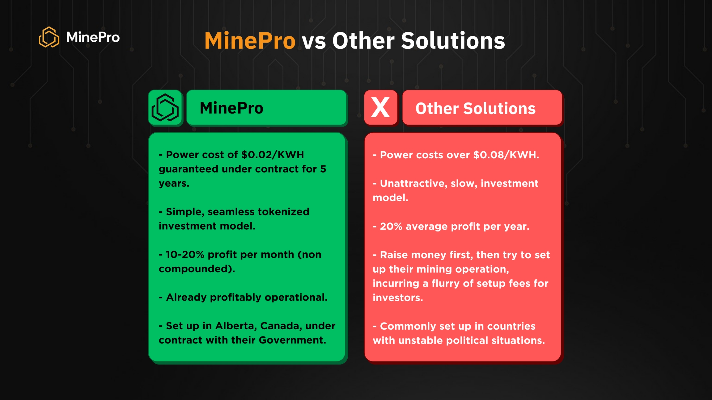 Many projects have ventured into countries lacking the correct infrastructure and economic stability in search of power costs even half as cheap as MinePro has access to in Alberta, Canada, only to fall victim to import/export laws and taxes, changes in costs of power overnight, and more, detailed further in our Hosting arm page. At the current moment, the most stable solutions out there provide a very limited APY and usually operate at a power cost of over $0.08/KWH. As well as operating through the model outlined below: