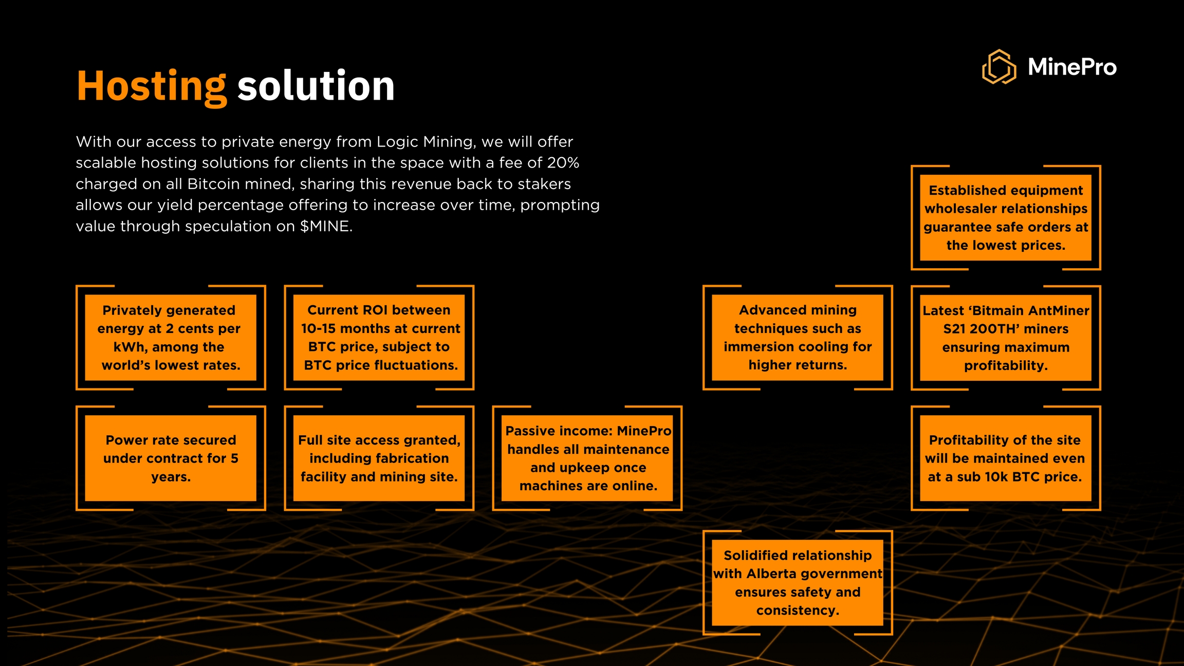It’s easy to see why MinePro will be such an attractive option for projects in the space looking to tokenize. We’ll deliver a safe, competitive, and reliable option for those looking for RWA exposure. Why buy real estate to maybe earn a fraction of a percent each month, when you can earn Bitcoin through MinePro at 5-15% per month? It’s an easy choice.