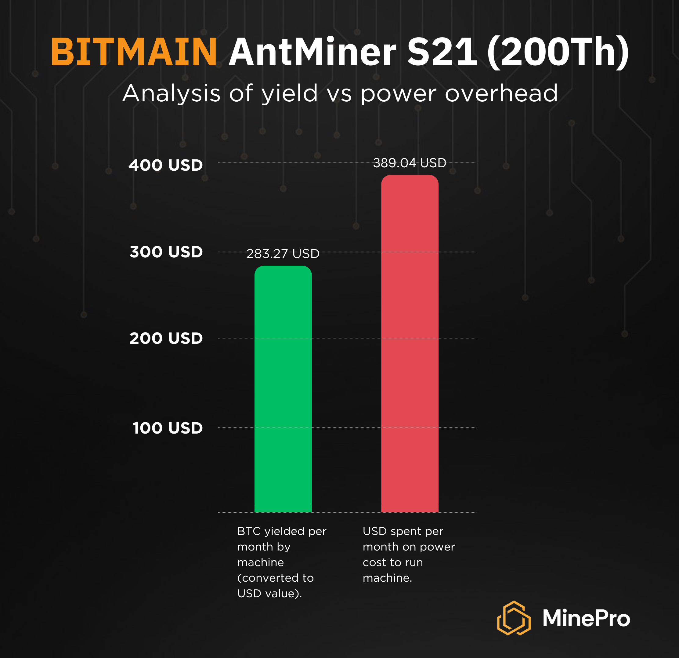 One Bitmain Antminer S21 200TH machine operating with a power cost of 15.45 cents per KWH (US average) produces a loss of -$105.77 per month. (Confirmed by https://www.nicehash.com/)